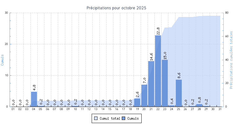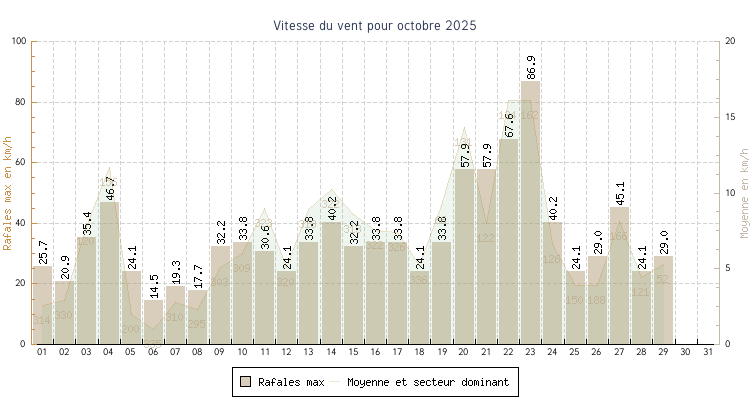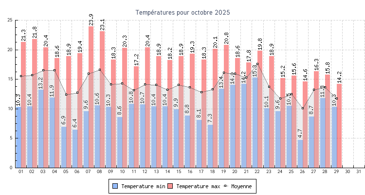 | 25 | 10.5 °C à 23:02 | 15.6 °C à 15:20 | 12.5 °C | 3.9 km/h (24.1 km/h) | 150 |
