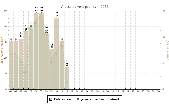| min | max | moy | Vitesse (rafales) | Secteur | ||
